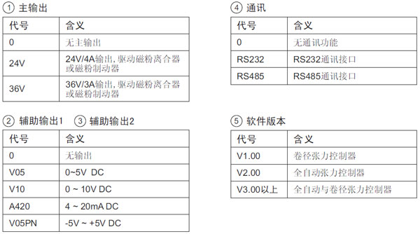 (2) TC818-24V/V05V05V0-V4.00表示主輸出為24V/4A,輔助輸出1和輔助輸出2為0~5V,軟件版本號為V4.00的張力控制器。