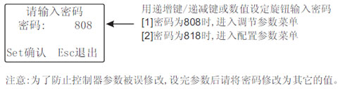 當控制器處于“自動控制”或“手動控制”顯示界面時,此鍵用于鎖定(防止誤操作)或解鎖,鍵鎖定后將使遞增鍵 、遞減鍵、Set/Esc鍵、自動/手動切換鍵、輸出開關鍵和數值設定旋鈕失效。